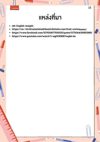 แหลงที่มา เพจ English insight https://xn--12cl9ca5a0ai1ad0bea0clb11a0e.com/fruit-worksheets/ https://www.facebook.com/107639677616126/posts/117504409962986/ https://www.youtube.com/watch?v=agIX9DKRVwg&t=4s